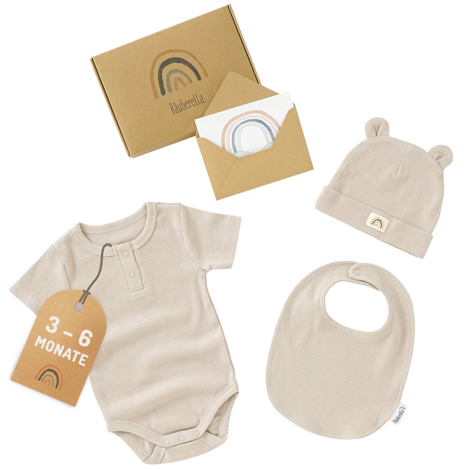 Dieses zauberhafte Geschenkset besteht aus einem Strampler, einer Mütze und einem Lätzchen – die perfekte Wahl für ein neues Baby! Alle Teile sind aus hochwertigem Material gefertigt und bieten maximalen Komfort.