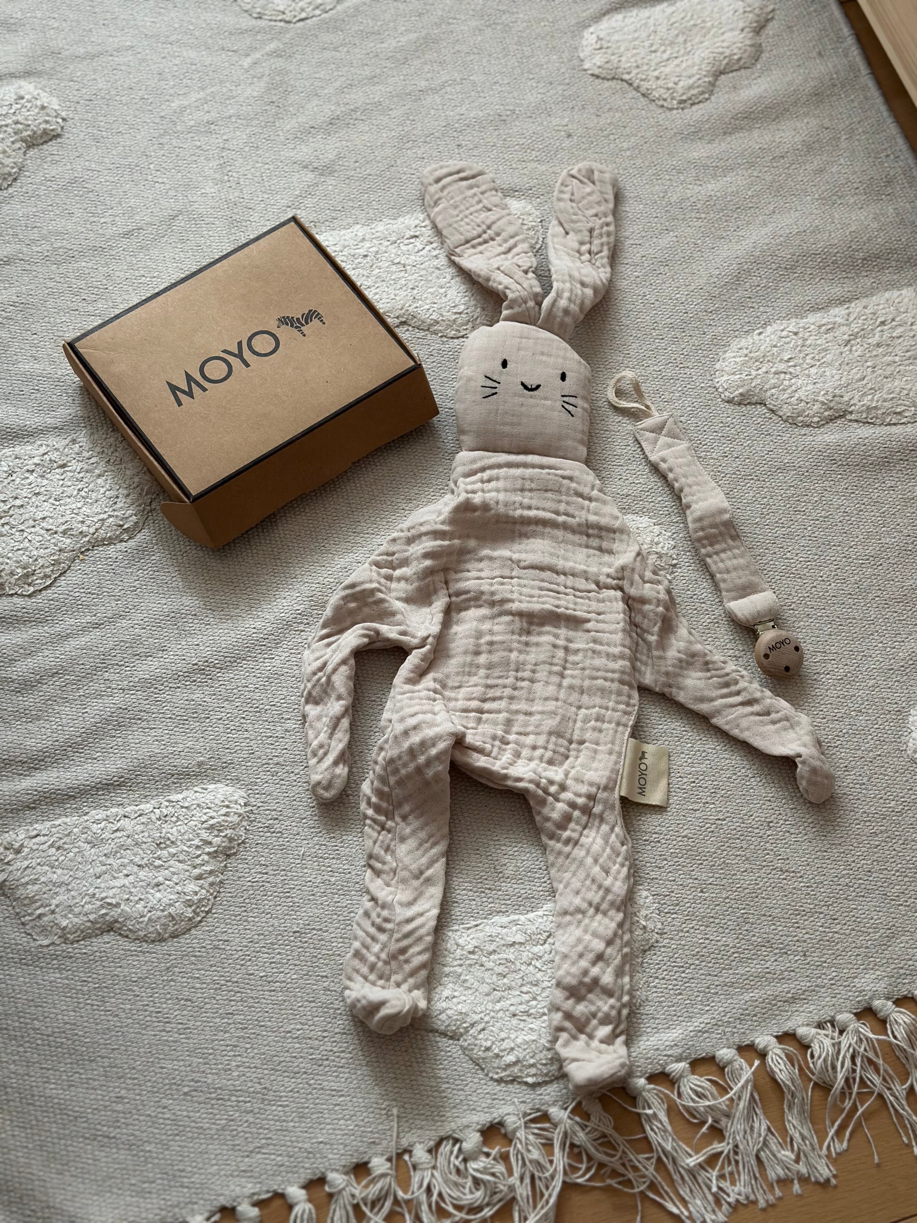 The lovingly curated MOYO gift set includes a soft, bunny-shaped comforter with long arms and legs for easy grasping, as well as a safe, durable pacifier clip – perfect for home and on the go. Manufactured to the highest safety standards and free of small parts that can be swallowed, both companions are ideal for the first few years of life. Presented in a beautiful gift box, the set makes a wonderful present for a birth, baptism, or baby photoshoot.