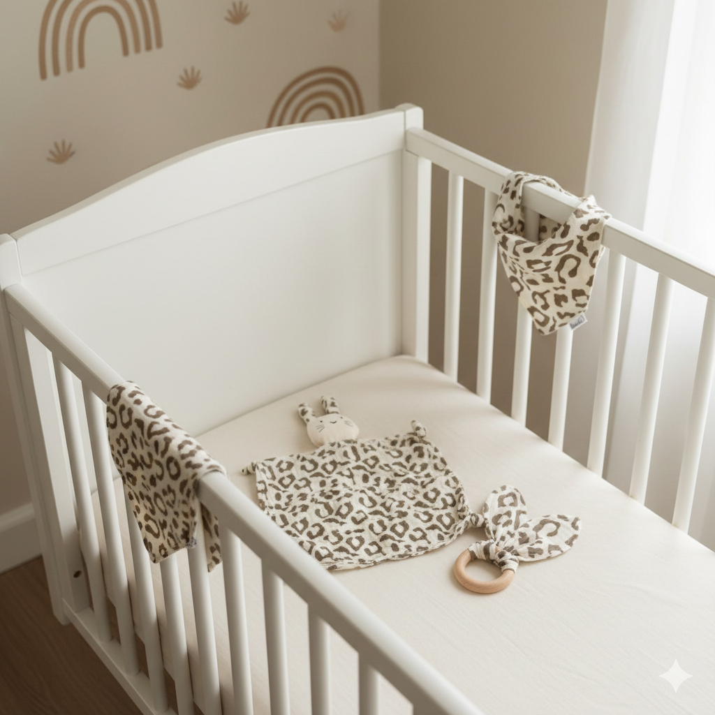 Geeignet ab 0 Jahren | Farbe: Beige Leo Optik | Material: 100% Bio-Musselin-Baumwolle & Naturholz