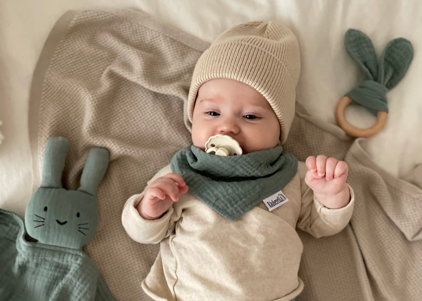 🐰 Schmusetuch in Hasenform – Das flauschige Schmusetuch aus Bio-Musselin wird schnell zum treuen Begleiter deines Babys. Die niedliche Hasenform ist perfekt für kleine Händchen zum Greifen und Kuscheln. Tipp: Das Tuch ein paar Nächte bei sich behalten – der vertraute Geruch der Eltern hilft beim Einschlafen.